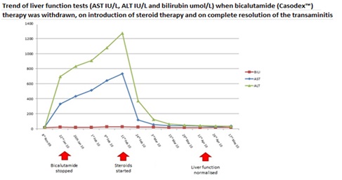 Another case report described a 59-year-old who after 4 days of bicalutamide treatment presented with acute liver failure manifesting as abdominal pain and distension, with ALT activity 40x maximum normal, and who died 4 days thereafter [7]. Transaminitis and acute liver failure have also been described [8]. Hepatotoxicity has been described in a patient with metastatic prostate cancer and previous resolved hepatitis B infection (surface antibody and core antibody demonstrable) [9]. The authors proposed this was a drug induced liver injury. These four patients did not receive corticosteroid therapy or undergo a liver biopsy.