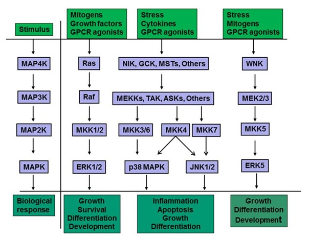 Mammalian cells have four major types of MAPKs cascade and these include ERK1/2, JNKs, p38 MAPK and ERK5 cascades [36-40] (Figure 1). Each of these cascades consists of a core module of three tiers of protein kinases termed MAPK, MAP2K, and MAP3K. There are seven MAP2Ks (also known as MEK, MAP/ERK kinase, or MKK) that differentially activate different MAPKs by dual phosphorylation on Thr and Tyr. Thus, ERK1/2 is activated by MKK1/2, p38 MAPKs are activated by MKK3, MKK4, and MKK6, JNKs by MKK4/7 and ERK5 by MKK5. The MAPKs regulate members of a family of protein Ser/Thr kinases termed MAPK-Activated Protein Kinases (MAPKAPKs). The MAPKAPKs are related enzymes that respond to extracellular stimulation through direct MAPK-dependent activation loop phosphorylation and kinase activation [42]. The deactivation of MAPKs is achieved through dephosphorylation catalyzed by MAPK-specific Phosphatases (MKPs) including dual specific MAPK phosphatases [43,44]. MAPKs mediate/regulate diverse cellular functions including embryogenesis, apoptosis, immunity, proliferation, and differentiation by integrating signals from intra- and extracellular stimuli [41,45-47]. The p38 MAP kinase pathway shares many similarities with the other MAP kinase cascades, being associated with inflammation, cell growth, cell differentiation and cell death [48,49].Activation stimuli: p38 MAPK is also known as Stress-Activated Protein Kinase (SAPK) since it is mostly activated by stresses such as ER stress, oxidative stress, metabolic stress and DNA damage, and by inflammatory cytokines [42,50-54]. The activation of p38 MAPK by a variety of stimuli (Figure 1) involves dual phosphorylation on Thr180 and Tyr182 by upstream MAPK kinases. While three upstream MAPK Kinases (MKKs), namely MKK3, MKK6 and MKK4, control the activation of p38 MAPK, MKK3 and MKK6 are considered the major activators of p38 MAPK [55-58]. A MAPKK-independent mechanism of p38 activation involves TAB1 (Transforming growth factor-beta-Activated protein Kinase 1 (TAK1)-binding protein 1) [59]. Interacting of TAB1 with p38 MAPK induces p38 autophosphorylation [60]. Inactivation of p38 MAPK involves dephosphorylation by phosphatases targeting threonine and tyrosine residues in the activation loop [61]. Phosphatases involved are Protein Phosphatase (PP) 2A add PP2C or Striatal Enriched Tyrosine Phosphatase (STEP) and Haemopoietic Tyrosine Phosphatase (HePTP) [49]. Inhibition of PP2A increases p38 activity by various stimuli [62-64]. In addition, microRNAs contribute to the homeostatic signaling of p38 MAPK pathway [40]. P38 MAPK isoforms: There are four known isoforms (α, β, γ and δ) of p38 MAPK with 60% homology and only α and β isoforms are expressed in livers [49,65,66]. Whereas p38α is ubiquitously expressed, p38β is mostly found in the brain, p38γ is predominantly expressed in skeletal muscle and p38δ gene expression is found in the lung, kidney, testis, pancreas and small intestine [49,67]. Activation of isoforms by upstream kinases differs based on stimuli and cell type [49,68,69]. In general, MKK6 can phosphorylate all four p38 MAPK family members, where as MKK3 activates p38α, p38γ and p38δ, but not p38β. In non-hepatic cells, MKK6 preferentially activates p38β MAPK [70] and MKK3 activates only p38α and p38 MAPKs [71]. Thus, MKK3 is expected to activate p38α and not p38β MAPK in the liver. In addition, p38α can also be phosphorylated by MKK4. Cyclic AMP has been shown to specifically activate p38α, but not p38β in adipocytes [72]. Selective activation of p38 isoforms has been reported in other cells [47,73,74]. Studies also suggest isoform specific effects of p38 MAPK. For example, p38α MAPK is involved in inflammation induced by proinflammatory cytokines, IL-1 and TNFα [75]. P38α and β MAPK have been shown to mediate cell cycle [67]. P38α but not p38β MAPK regulates chronic pain development [76]. P38α promotes apoptosis and p38β inhibits apoptosis [77,78]. P38δ synergistically regulates ERK pathway, whereas p38α medicates nuclear factor kappa B (NFкB) pathway for drug resistance [79].Hepatic effects of p38 MAPK: Many hepatic functions are affected by p38MAPK. These functions include regulation of proliferation [80], protection against hypoxic injury [81], gluconeogenesis [82], enhancement hepatic ketogenesis [83], improvement of hepatic steatosis [84], inhibition on the progression of liver fibrosis [85], involvement in the pathogenesis and progression of intrahepatic cholestasis of pregnancy [86], bile acid synthesis [87] and anti-apoptotic effect of TUDC [88], bile acid-induced apoptosis [89,90], and biliary excretion of bile acids [91]. The p38 MAPK also regulates transporter translocation. For example, p38 MAPK is involved in GLUT4 translocation [92], EGF receptor endocytosis [93] and serotonin transporter trafficking [94]. In the liver, the p38 MAPK pathway is involved in the PM translocation/retrieval of MRP2 and BSEP [95,96]. Note that PM translocation of NTCP is not regulated by p38 MAPK [97,98]. Thus, the regulation of PM translocation/retrieval of MRP2 and BSEP by p38 MAPK in hepatocytes is discussed below.