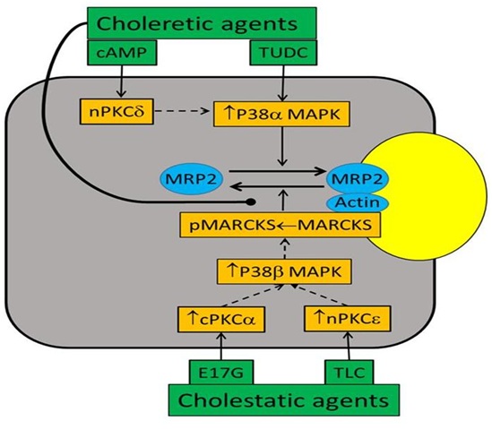 Several transporters are involved in hepatocellular transport of organic as well as inorganic solutes [5]. Three of these transporters, namely Na+-Taurocholate Cotransporting Polypeptide (NTCP), Bile Salt Export Pump (BSEP) and Multidrug Resistance Protein 2 (MRP2) are primarily involved in vectorial transport of organic anions involved in bile formation. NTCP mediates Na+/TC cotransport across the sinusoidal membrane. BSEP and MRP2 are ATP-Binding Cassette (ABC) transporters, located at the canalicular membrane and mediate canalicular secretion of bile salts and conjugated organic anions, respectively [9-12]. The coordinated function of NTCP and BSEP allows transport of conjugated bile salts into the canalicular space providing the stimulus for that fraction of bile known as bile-dependent bile formation. It should be noted that while some bile salts (taurocholate, TC and tauroursodeoxycholate, TUDC) produce choleresis, others (taurolithocholate, TLC and taurodeoxycholate, TDC) are known to produce cholestasis [2,13]. The bile-acid independent fraction of bile results from biliary excretion of other solutes including conjugated organic anions transported by MRP2 [14]. Transporter regulation: It is now well established that apart from genetic defects [15-18], regulation of these transporters at the level of transcriptional, translational and post-translational modifications may be altered by chemicals/disease processes. Indeed, cholestasis is associated with down-regulation of NTCP and MRP2 [19,20] with a relatively preserved expression of BSEP [19]. It is becoming evident that transcriptional regulation of hepatocellular transporters is primarily mediated via the nuclear receptor superfamily [3,21], while the post-translational regulation is mediated via classical second messengers. The transcriptional changes are delayed effects of cholestasis that assure long term adjustments of transporter functions. On the other hand, post-translational regulations involve short-term rapid changes in Plasma Membrane (PM) localization of transporters [1,5,6] and these permit rapid changes in bile formation. This review focusses on short-term regulations. The long term transcriptional regulations have recently been reviewed by others [3,21]. Short-term regulation: A transporter must be translocated to the appropriate membrane for it to transport its solute across that membrane. This is a complex regulated process requiring participations of various signaling molecules along with vesicles and cytoskeletons. A breakdown in this regulated process can lead to a decreased amount or an absence of a transport protein at its intended site resulting in decreased or no transport function and hence cholestasis. It is becoming evident that a translocation defect is an important event in cholestasis. Thus, experimental cholestasis induced by bile duct ligation, endotoxin, TLC and Estradiol-17beta-D-glucuronide (E-17G) is associated with decreased level of NTCP [22], MRP2 [20] and BSEP [23,24] in the plasma membrane. Certain other agents (cAMP, TC, TUDC) have been shown to stimulate translocation of these transporters to the membrane [12,25-29]. Acute cholestasis induced by TLC and E-17G is associated with the retrieval of BSEP and MRP2 from the canalicular membrane and these effects are reversed by cAMP [23,24,30]. TUDC has been shown to reverse TLC-induced retrieval of MRP2 [27,31]. These results highlight the importance of translocation defect in acute cholestasis. Thus, an understanding of the cellular mechanisms regulating transporter translocation and retrieval is necessary for medical management of patients with cholestasis. A number of signaling pathways including Protein Kinase Cs (PKCs), p38 Mitogen Activated Protein Kinases (p38MAPKs), Rab proteins, Protein Phosphatases (PPs), actin binding proteins, ca2+ and Phosphoinosotide-3-Kinases (PI3Ks), [1,5,6,32,33] have been implicated in the regulation of PM localization of transporters (NTCP, BSEP and MRP2) by cAMP, TUDC, E17G and TLC [1,5,34,35]. In this review, we discuss the regulation by p38 MAPK as the role of p38 MAPK has not recently been reviewed.