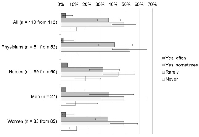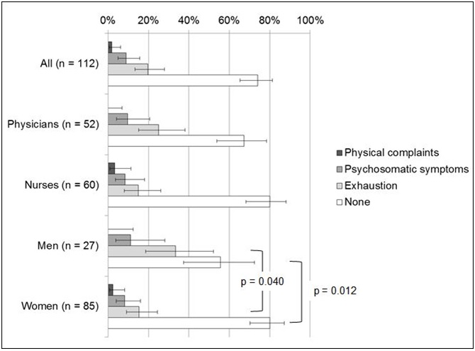 83 (74.1%; 95% CI 65.3-81.3%) of all participants did not suffer from physical complaints, psychosomatic symptoms or exhaustion (Table 1, Q1). A higher percentage of women than men said they suffered from none of these complaints (p=0.012). Physical complaints were experienced only by 2 participants (1.8%; 95% CI 0.5-6.3%), psychosomatic symptoms by 10 participants (8.9%; 95% CI 4.9-15.7%), and exhaustion by 22 (19.6%; 95% CI 13.3-28.0%). Men suffered more frequently from exhaustion than women (p=0.040). No significant differences were found between physicians and nurses. The distribution of the answers among neonatal physicians and nurses is shown in Figure 1.