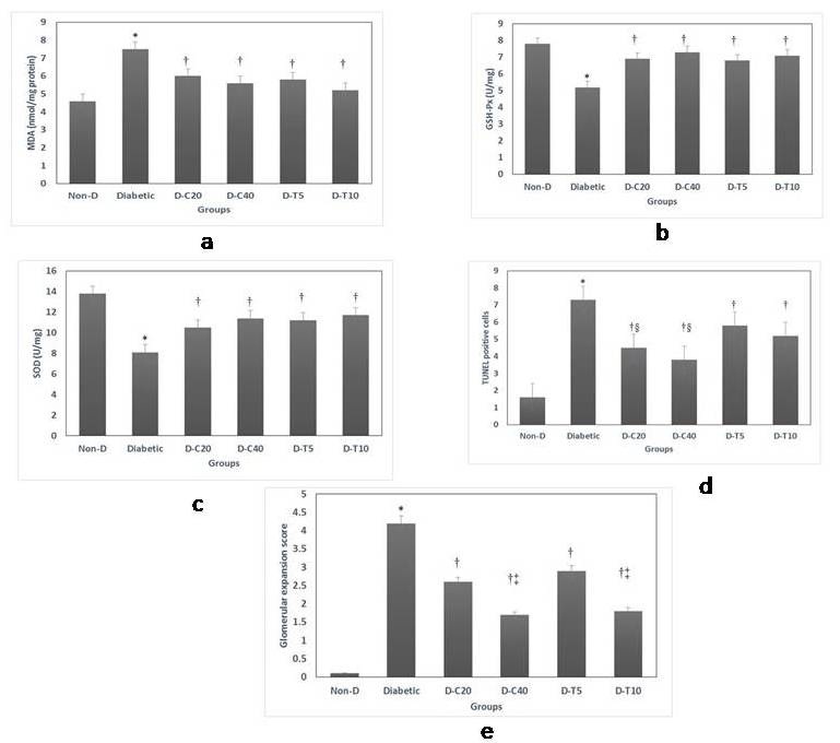 Figure 2: Kidney tissue changes in oxidative status, apoptosis and glomerular matrix expansion score. 2a: MDA (Malondialdehyde), 2b: GSH-Px (Glutathione Peroxidase), 2c: SOD (Superoxide Dismutase), 2d: TUNEL assay and 2e: Glomerular matrix expansion score.