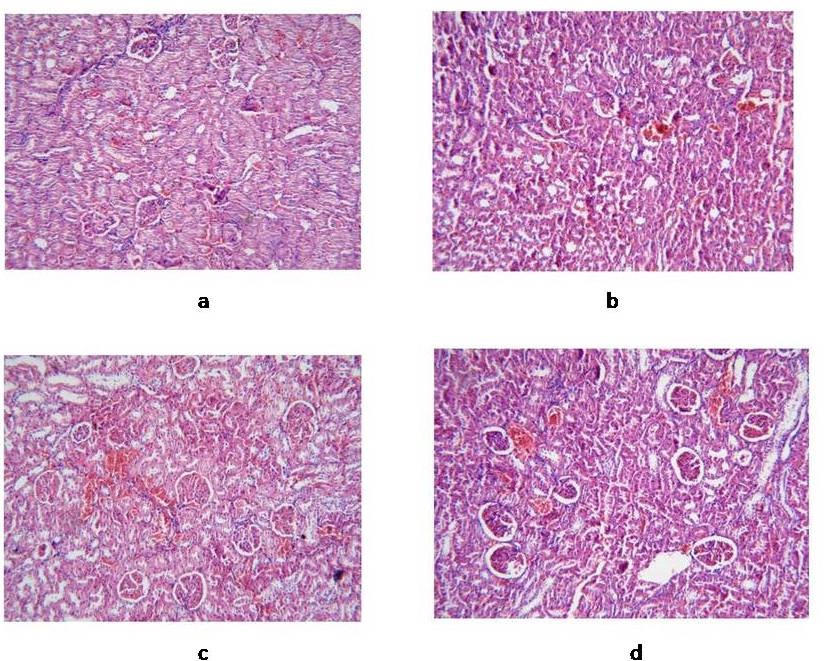 Figure 3: Light microscopic findings in kidney specimens isolated from different rat groups (H-E). 3a: Normal control; 3b: Diabetic group, showing mesangial expansion, nodular sclerosis, and thickening of basement membranes; 3c: Diabetic rats treated by canagliflozin 40 mg/kg, showing diminished glomerulosclerosis, and normal basement membrane; 3d: Diabetic group treated by telmisartan 10 mg/kg, showing marked attenuation of kidney lesions.
