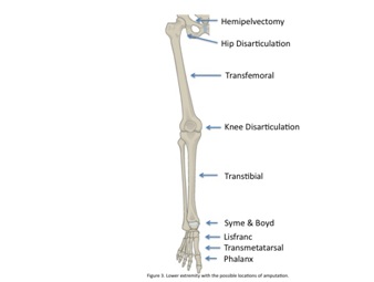 Amputation of the lower extremity is a common procedure performed by orthopedic surgeons at various levels for pathology ranging from tumor to sepsis to trauma. Treating patients with amputation requires not only ample knowledge of anatomy, but also a thorough understanding of gait biomechanics along with the current state of prosthetics and orthotics. Understanding the options for lower extremity amputation is an important part of an orthopedic surgeon’s armamentarium as it allows for the ideal surgical procedure to be performed that maximizes optimal post-operative function and rehabilitation (Figure 3). Treating the whole patient by assessing pre-operative functional status, evaluating medical co-morbidities, and reviewing the surgical pathology requiring amputation will help the surgeon and patient come to a consensus decision on the operation to be performed and rational functional goals post-operatively. Teamwork when treating amputees remains paramount for a successful return to function.
