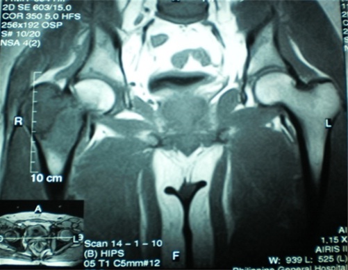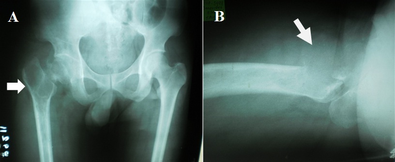 A 35 year old male truck driver had a 4 month history of intermittent, constricting pain of the right hip and groin area with a maximum VAS score of 6/10. The pain was present even at rest and was not exacerbated by physical activity nor position. He complained of walking with a limp, and difficulty in ambulation without support. The patient did not recall any history of fall nor previous trauma to the right hip. There were no other associated symptoms such as fever, weight loss, or presence of mass on the right hip. The patient sought initial consult with a general practitioner, and diagnostic work-up including plain radiographs of the hip were done. The results of the blood examination which included complete blood count, erythrocyte sedimentation rate, C-reactive protein, and alkaline phosphatase did not imply infection or malignancy. The plain radiographs of the hip showed a well-delineated osteolytic lesion in the proximal femur, from the femoral neck extending down to the area of the lesser trochanter. There was no cortical break noted on the plain X-ray films. The patient was prescribed analgesics for pain, advised non-weight bearing, and was given a referral to an orthopedic tumor specialist. However, the patient did not comply with the advised referral and follow up. He resumed his regular physical activities and was full weight bearing against medical advice.