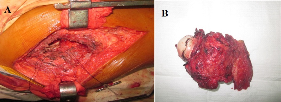 Figure 3: En-block resection of proximal femur up to 1.5 cm distal to the base of the lesser trochanter including insertion of iliopsoas, vastus lateralis, gluteus medius, short external rotators and proximal portion of tensor fascia lata.