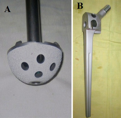 Figure 4: Total hip replacement implants used: A) An uncemented grit-blasted titanium acetabular cup, coated with hydroxyapatite, B) A 160 mm long cobalt chrome GTF calcar-replacing femoral stem.