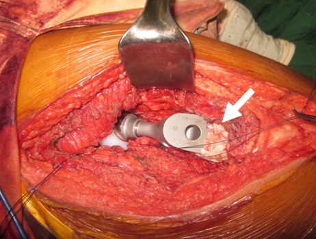Figure 5: Arrow pointer showing excess cement that was moulded around the junction between the femoral shaft and the calcar component of the implant.