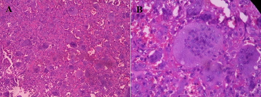 Figure 6: Histopathologic section showing osteoclastic giant cells, which are characterized with numerous nucleoli centrally located within the cytoplasm.