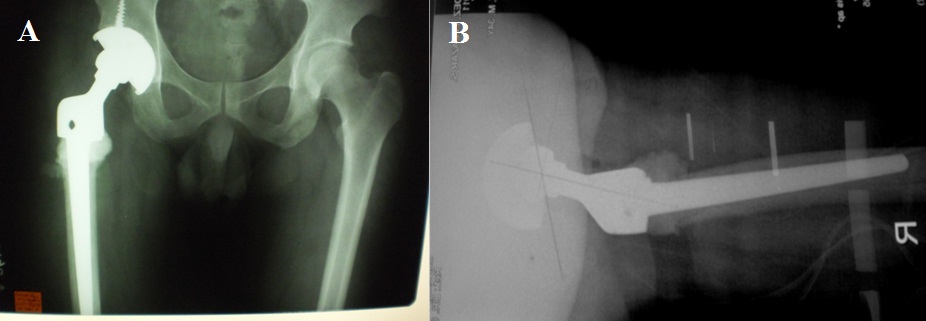 Hip joint reconstruction following excision is valuable for maintaining the stability and normalization of gait. However, there is always the risk of sacrificing vital tendinous insertions of hip abductors, adductors, flexors, and external rotators if the excision involves removing either the greater or the lesser trochanter. Furthermore, there is also the risk of taking out the dense vertically oriented calcar femorale at the posteromedial portion of the proximal femur, which support majority of the hip axial load. As with our patient, we expected to resect distal to the base of the lesser trochanter so we opted for a calcar-replacing long femoral stem. The aim is to have proximal portion of the femoral implant sitting on top of the femoral cortex, while the long stem provides stability and diaphyseal fixation. There are also designed holes on the proximal part of the femoral implant for re-attachment of the hip abductors and the iliopsoas (Figure 4B). Another option for hip reconstruction after excision of the proximal femur, would be an Allograft-prosthesis Composite (APC). Malhotra et al., reported a case series of 18 patients diagnosed with GCTb of the proximal femur treated with excision of the proximal femur, and APC using irradiated fresh-frozen allograft. With a mean follow-up of 54 months, all patients had complete graft union and excellent Harris hip scores in 13 patients [22]. We did consider using a proximal femoral allograft composite prior to the operation, however there was none available at our institution at that time. We also decided to do a cemented femoral fixation not only for stability, but also since the use PMMA bone cement seems to reduce tumor recurrence rate.