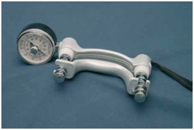 Function was measured in the present study. Each subject was evaluated at the baseline (week 0), at the end of treatment (week 6) and at 1 month (week 10) after the end of treatment. Function was measured by grip strength. Grip strength is defined as the amount of force each subject is able to generate with an isometric gripping action [19]. Force was measured in pounds with a Jamar hand dynamometer (Figure 3) that had adjustable handles to accommodate different hand sizes. The arm was placed in a standardized position of elbow extension, forearm pronation and internal rotation of the upper limb such that the palmar aspect of the hand faced posterior with the upper limb placed by the subject’s side. Subjects were then instructed to squeeze the dynamometer handles and then to release their grip [19]. The attained grip force was subsequently recorded, and the reading was not visible to the subject. Three measures of pain-free grip strength were recorded with a 30 seconds rest interval between each measurement, and the mean value of these repetitions was calculated. It is a valid and reliable outcome measure in LET patients.