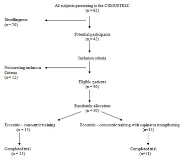 Sixty two subjects eligible for inclusion visited the CUMUSTREC with in the trial period. Twenty were unwilling to participate in the study, and 12 did not meet the inclusion criteria described above. The other 30 patients were randomly allocated to one of the two possible groups: (a) eccentric - concentric training of wrist extensors (n=15; 5 men, 10 women; mean (SD) age 28.06 (3.56) years); (b) eccentric - concentric training of the wrist extensors and supinator strengthening (n=15; 9 men, 6 women; mean (SD) age 29.53 (4.34) years). Subject flow through the trial is summarized in a CONSORT flow chart (Figure 4).