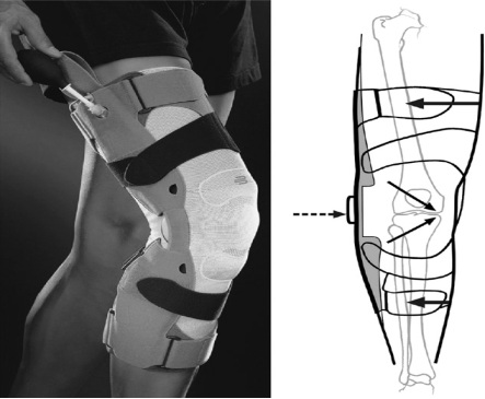 OA is an epidemic with no known, effective cure. A knee with OA will be further damaged if it is not protected physically [26]. Bracing (as shown in Figure 2) could be a useful, non-invasive measure to protect the uni-compartment knee joint OA. The aim of the brace is to reduce contact stress in the affected part of the joint, it could be useful for correcting mal-alignment and decreasing impairment associated with knee OA [13]. The efficacy of valgus knee braces and foot orthoses in the management of MC knee OA were assessed through the systemic review conducted by Raja and Dewan [27]. The results suggested that knee pain (as measured by the Visual Analogue Scale, VAS), analgesic consumption and knee stiffness were decreased significantly by using offloading knee braces and foot orthoses. In addition, knee braces and foot orthoses can improve balance and physical function scores (such as McMaster-Toronto Arthritis score and Knee injury and osteoarthritis outcome score for pain and functional status). As well as, it has been reported that the prolonged use of knee braces (6-12 months) may improve muscles proprioception and several biomechanical factors (such as moments around the knee joint). However, long-term effect of foot orthoses was not discussed clearly in the study. In fact, this review assessed a significant number of studies (25) with a significant overall sample size (more than 1100 patients with knee OA), and this can enhance the result accuracy significantly. Nevertheless, there were many limitations of this review. First, a wide range of age groups were included, for instance, some of the studies included patients in their thirties, whereas other studies only included patients in their seventies. Consequently, result accuracy may be affected, as OA is an age-related disease, and different age groups may have different disease activity rates and different responses to treatment. However, a wide range of age groups would be more representative of the normal population. Second, the studies assessed different types of braces and foot orthoses, which could cause the results to contain bias, because patients’ responses to braces or to foot orthoses may be directly affected by their design, and finally, only 6 Randomised Controlled Trials (RCT) were included, while the remaining studies were either a retrospective or a prospective cohort, with no control group or randomisation, and this may affect the results accuracy significantly.