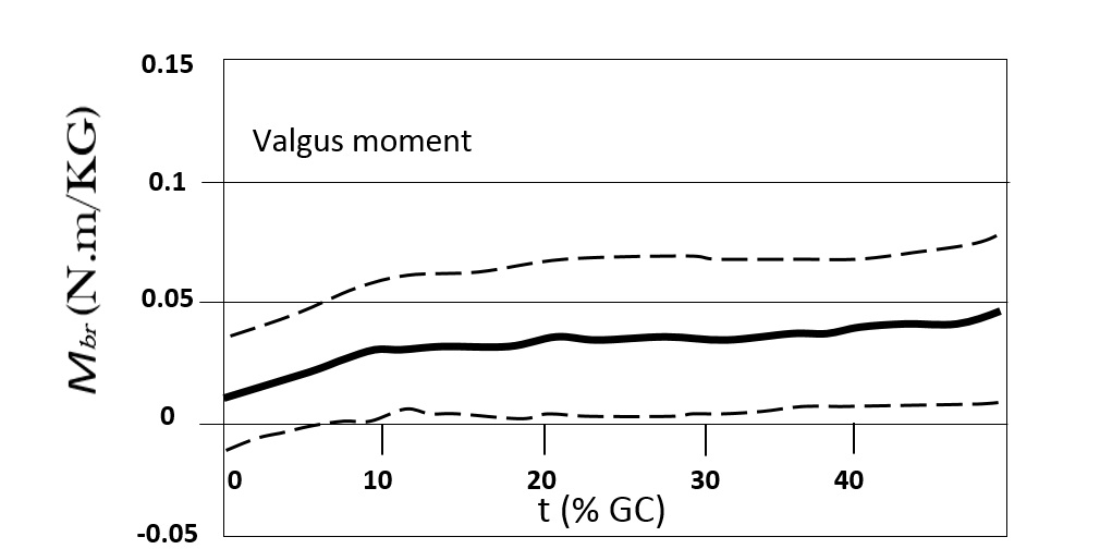 In addition, the biomechanical effects of valgus knee braces in MC knee OA were evaluated by Schmalz, et al., through performing gait analysis for 16 patients with MC knee OA after 4 weeks of wearing braces [29]. The results showed that the effect of moments created by the brace on the knee joint were as follows: the brace valgus moment (Mbr) was increased slightly during the early and late parts of the stance phase of the gait cycle, while it decreased in the mid stance phase (when knee flection occurs) as shown in figure 3. Additionally, the mean and maximum value of moment generated by the brace during the stance phase was equivalent to only 9 and 10 percent of the External Knee genu-varus (Adduction) Moment (EKAM), respectively (as illustrated in Table 1). This means that the knee brace did not affect the knee EKAM significantly, which leads to conclude that the actual effect of valgus knee braces is to compensate part of the external load, which is normally compensated by muscles and ligaments in an osteoarthritic knee without a brace, hence, decreasing the medial compartment load. This means that the real effect of braces regarding symptom relief could be due to its effect on relieving muscle tension and decreasing MC load. However, the small sample size limits the study’s reliability, as well as the fact that the participants’ gait was only assessed after 4 weeks of wearing the braces, and there was no baseline data of gait analysis to compare with; so, it is difficult to decide whether this result reflects the real effects of braces in patients with knee OA or it is inaccurate, as the patients’ symptoms had improved during the 4 weeks of wearing braces, due to decreased muscle spasms and improved overall joint biomechanics.