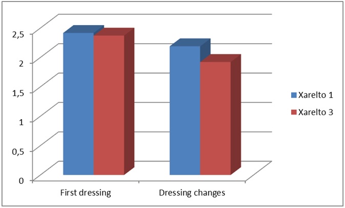The use of rivaroxaban (Xarelto®) earlier in the post operative period is associated with higher rate of dressing change and earlier dressing change. The use of rivaroxaban (Xarelto®) early in the prevention of VTE is also associated with an increased average total blood loss when compared with those using rivaroxaban (Xarelto®) at a later stage (p < 0.001). Patients who received rivaroxaban (Xarelto®) directly post operation required more dressing changes (2.19) as opposed to 1.92 dressing changes in those patients who received rivaroxaban (Xarelto®) at a later stage (p < 0.01).