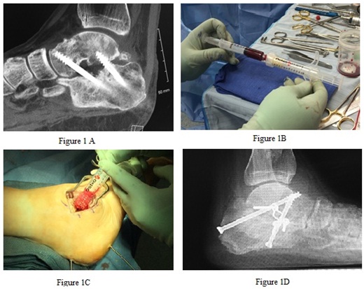 Figure 1: A Shows a CT scan revealing nonunion at subtalar joint with hardware failure. B is preparation of 5 mL of allogeneic bone morphogenetic protein granules being mixed with 6 mL of bone marrow aspirate. C shows delivery of grafting materials into the nonunion site. D is a weight bearing lateral plain radiograph at 3 months post-operatively showing solid arthodesis with alternative hardware placement.