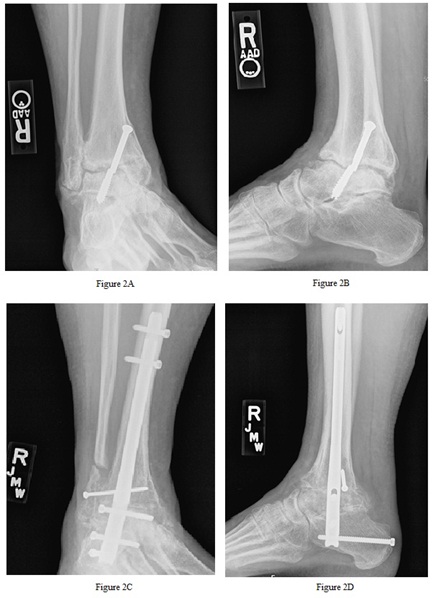 Figure 2: A (mortise) and B (lateral) are pre-operative images of patient 3 demonstrating ankle nonunion with anterior translation, subtalar joint arthritis, broken hardware. C (mortise) and D (lateral) are post-operative images demonstrating solid union at the ankle and subtalar joints, as well as the fibula onlay site.