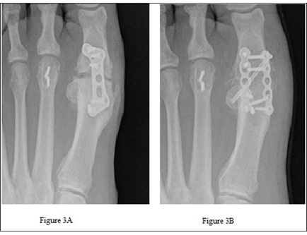 Figure 3: Patient 1 shows pre-operative nonunion of the 1st metatarsal phalangeal joint with broken proximal screw (A) and post-operative arthrodesis (B).
