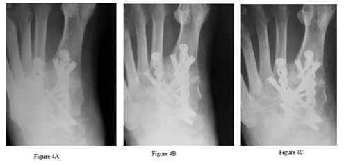 Figure 4: New bone growth is demonstrated in patient 7. AP image two weeks post-operative (A) shows open joints at the 1st tarsometatarsal and medial naviculocuneiform. AP image at 48 days post-operative (B) shows solid arthrodesis at those joints. AP image at 139 days post-operative (C) demonstrates new bone growth at the 1st interspace between the 1st and 2nd metatarsal base.