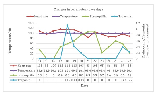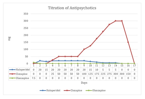 On admission, patient was started on haloperidol 10 mg per oral (PO) twice daily; lorazepam 1 mg PO in the morning and 2 mg PO at bedtime; and lithium 300 mg PO twice daily. By admission day 3, his symptoms became worse including poor self-care, avolition, apathy, waxy flexibility, posturing, automatic obedience, and ambitendency. Subsequently, patient was started on clozapine at 25mg PO daily and haloperidol was gradually tapered and eventually discontinued on day 14. Clozapine was gradually titrated up to 150 mg PO twice daily by admission day 14. On admission day 17, patient developed persistent tachycardia (heart rate:115 bpm), fever (102.4ºF), eosinophilia, and mild leukocytosis (11,200 cells/ml) with automated neutrophil count of 7600. (Figure 1)