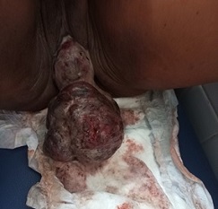 It was about Mrs D.D, a 48 years old patient, 4th gesture 4th pare referred in our service for the management of a budding ulcerous mass delivered by the vulva and associated with metrorrhagia evoking an invasive cancer. In this history, there was a caesarean section at the time of her third delivery. Examination on admission found clinical anaemia and an extravascular mass of firm, locally necrotic consistency, about 7 cm in size. This mass is surmounted by an atrophic uterine mucosa that bleeds easily on contact as shown in figure 1.