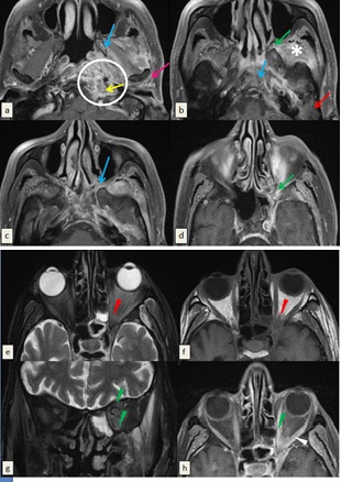 Figure 1: Magnetic resonance imaging (MRI) (3 Tesla) of the skull base performed in T1-weighted sequence before (f) and after saturation of the fat signal and injection of gadolinium (a, b, c, d, h) and T2-weighted sequence after suppression of the fat signal (e, g) ruling out necrotizing otitis externa. The wall of the left external auditory canal is thickened and enhanced after injection of gadolinium (White arrow) associated with inflammatory filling of mastoid cells and middle ear cavities (Red arrow). T1-weighted images show cortical irregularities and enhancement of the bone marrow of the pterygoid process and the clivus related to the osteomylelitis of skull base (Blue arrows).There is synovitis of the left temporomandibular joint attested by the inflammatory changes of periarticular soft tissues(pink arrow). Signal anomalies and enhancement after contrast spread to the ipsilateral infratemporal fossa (Asterix) and to the parapharyngeal, vascular and retropharyngeal spaces (Circle) with several small contiguous collections of parpharyngeal space forming an inflammatory pseudo-mass bulging into the nasopharynx. Extension to the vascular space is accompanied by thrombosis of the ipsilateral jugular vein (Yellow arrow). Demonstration of an obliteration of the fat of the pterygopalatine fossa and the inferior orbital fissure (Green arrows) becoming hypointense in T1-weighted images, hyperintense in T2-weighted images and enhancing after contrast. The intra-orbital extension is attested by the proptosis, intraconal fat stranding (Red arrowhead) and by thickening, edema and significant enhancement of the orbital muscles (Green arrow head). No enhancement of optic nerve in retro-bulbar or intraorbital region was detected.