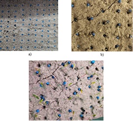 Figure 3: General layout of the seeds: a – after sowing; b – on the 4th day; c – on the 10th day