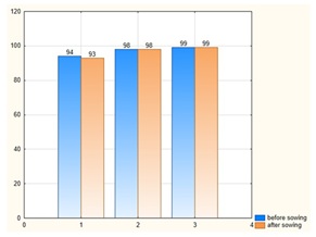Thus, the viability of sugar beet seeds before and after sowing does not differ. That is, the mechanical interaction of seed material with the structural elements of the seed meter does not have negative consequences and does not reduce the viability of seeds.