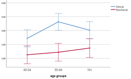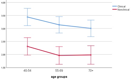 The questionnaires showed that a total of 10 subjects had not completed the ECR: 8 from the clinical sample and 2 from the nonclinical sample. Five subjects in each of the middle and oldest groups and none of the youngest group were among the non responders. Statistical analysis of the data also revealed that some patients had apparently answered according to a fixed pattern, i.e., they had answered all questions either with 1 or 7, although 14 questions contained negative formulations. This applied to 3 patients in the middle group, 4 in the oldest group, and none from the youngest group, all of the clinical sample. These questionnaires were excluded from further analysis, but this reduced the sample size. Missing values were replaced using the expectation maximisation method.