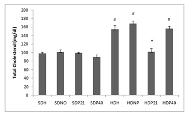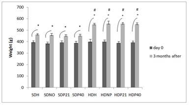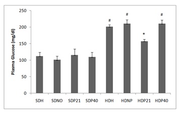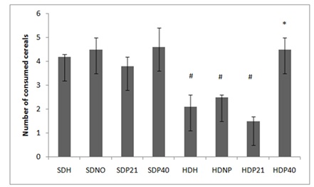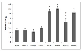 *Significant difference (p <0.001) of the HDP21 group when compared with the other groups that received a high calorie diet # Significant difference (p <0.001) when compared with the groups that received a standard diet.