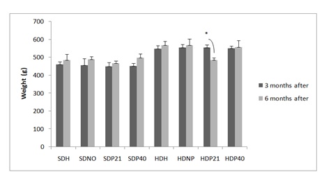 Figure 2: Variation in body weight during the treatment period * Significant difference (p <0.001) when compared before and after treatment in the HDP21 group.