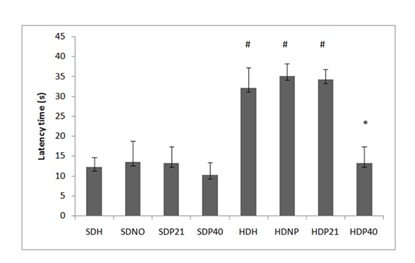 The eating behavior test assesses appetite behavior. Thus, a lower latency to meet food indicates greater food appetite [10]. Of the 4 groups of animals submitted to a high calorie diet, 3 of them had a significantly longer latency time (p <0.001) to reach the food in relation to the groups that received the standard diet. The HDP40 subgroup exhibited significantly shorter latency times (p <0.001) for arrival at the froot loops in relation to the other obese groups, which demonstrates a greater appetite and interest in food compared to the other groups that received the high calorie diet. The high calorie diet alone may have inhibited the appetite of the HDH, HDNP and HDP21 groups. There was no significant difference between the HDP40 group and the groups that received the standard diet (Figure 3).