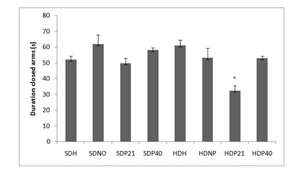 Time in the closed arm. *Significant difference (p <0.001) in the HDP21 group when compared to the other groups.