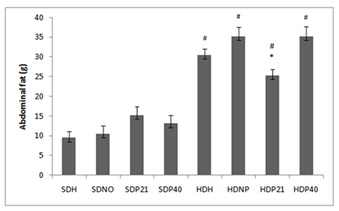 The amount of abdominal fat was also higher in the groups that received a high-calorie diet (p <0.001), compared to the subgroups that received the standard diet. However, the HDP21 subgroup exhibited significantly lower results compared to the other groups that also received the hyper-palatable diet (p <0.001) (Figure 7).