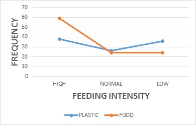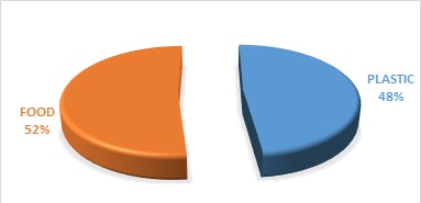 More so, dominant solid-waste materials and foraging intensity recorded a significance X2 = 6.797 df=2, P < 0.05 (figure 10). Some of the solid waste materials in dumpsites are incinerated in order to prevent windblown paper materials littering the school premises. Hence, the management of paper-waste materials on dumpsites might be easier as compared to the plastics and food fragments delivered mainly by campus restaurants. Unfortunately, the inability to segregate solid-waste materials on dumpsites complicates avian dumpsite foraging. Birds were observed foraging on plastic materials on dumpsites which were not rich in food fragments, a problem that could generate digestion complications. The major solid-waste materials recorded were food 52%, and plastics 48% (figure 11). Waste dumps rich in food fragments were observed with a hug population of birds.