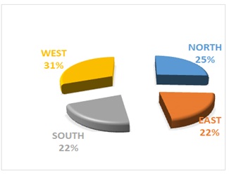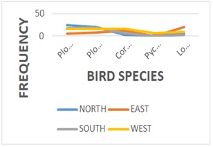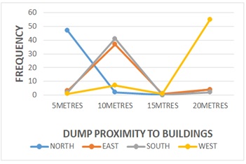 There was a significance between waste-dump location and proximity to buildings X2 = 277.057 df=9, P=0.000 (Figure 4). Waste dumping in this campus is not segregated, hence, the mixture has created a lot of odorous emission problems, especially to neighboring offices and classrooms where you have staff and students. The western flank location was richer in waste fragments 31% compared to northern 25%, southern 22% and western flanks 22% respectively (figure 5). The northern flank of the campus had more human activities, generating more waste materials, a source of hug bird population activity. Birds were frequently observed flying into the dumpsites whenever the human presence was further, and flying away when it was nearer. Waste-dumps are a feeding source for the wild-bird population in this area especially during the school season. The unavailability of enough food resources in the neighboring bushes to the campus might be the main reason of this hug aggregation of bird population on the campus dumps. Nonetheless, wild birds seem to have adjusted their feeding behavior to adapt to human-dump-food generation through.