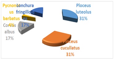 The results of this study has shown a positive significant correlation on bird species and dump location r = 0.756, P = 0.000 (figure 2). Solid waste generation and disposal is a human activity that needs good management especially in cities and university campuses congregating human population in large scales. University of Yaoundé II has a hug student population, university office staff, documentation centers and other related businesses. The human activity in the campus generates a lot of solid waste, disposed randomly behind the buildings. The improper disposal of the solid waste materials in the campus has raised a lot of public concern. Poor solid waste disposal and management in these kind of places harboring hug human population makes life uncomfortable. Solid waste in this campus consist of fragments of carbohydrate, meat, fish, plastics, wires, iron, glasses, paper, human feces, flies, rodents, and birds. More so, the waste-dumps release odorous emissions which are very offensive and could be infectious. The study observed a dominant population of Ploceus luteolus 31% and Ploceus cucullatus 31%, compared to Corvus albus 17%, Lonchura fringilloides 17%, and Pycnonotus barbatus 4% on waste-dumps (figure 3). However, the study only considered the activities of birds on these waste-dumps. Dumpsites have been lucrative feeding sites for birds, insects, rodents, and many other wildlife species in the world. They provide availability of food subsidy to many wildlife species, especially the birds in the campus of University of Yaounde II. Colonies of bird species were observed feeding on the waste-food fragments for survival purpose.