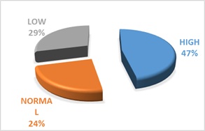 A positive significant correlation was recorded on foraging intensity and bird species X2 = 26.768 df=8, P=0.001 (figure 6). The survey recorded a high foraging activity of birds 47%, compared to low 29% and normal 24% respectively (figure 7). Any bird species or colony found on dumpsites had an activity target, foraging on fresh and old waste dumps for metabolism energy purpose. The study noticed a reduced bird-activity output on waste-dumps that never received fresh waste materials either from classrooms, documentation shops and restaurants. Lower bird activity was witnessed whenever they sighted human population nearby. The scarcity of bird-food in nearby bushes could increase their colony population on campus dumps. Unfavorable weather condition has been documented in many studies to slow down the foraging activities of birds and other wildlife species. Heavy snowfall and rainfall are environmental factors that have played the role of pushing some bird species into rest than foraging.