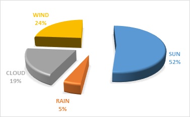 There was a significance on weather changes and bird-foraging intensity X2 = 10.221 df=6, P < 0.05 (figure.8). Weather conditions such as heavy rainfall have played a significant role in reducing or halting the foraging activity of wildlife in the wild. The sunny weather received the highest foraging activity engagement 52%, compared to wind 24%, cloud 19%, and rain 5% respectively (figure.9). The survey witnessed a remarkable bird population and foraging activity reduction during intensive rainfall. Birds flew into nearby bushes and returned to the dumpsites immediately after the rainfall. However, during and immediately after the rain, waste materials such as paper and plastics could no longer be windblown due to their high moisture content. Cameroon experiences heavy rains during some periods of the year, which sometimes flood cities.