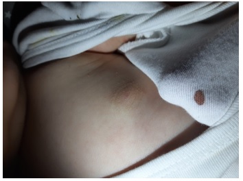 The patient had a history of recurrent urinary tract infections and was on prophylaxis with trimethoprim/sulfamethoxazole. She was exclusively breast-fed until 6 months, with a weight evolution in the 85th percentile. Her head circumference was above the 97th percentile, however followed a parallel growth curve and she exhibited normal neurodevelopment and head ultrasound, consistent with familial macrocephaly. Family history was negative for bleeding diathesis, breast carcinoma, or endocrine disorders.