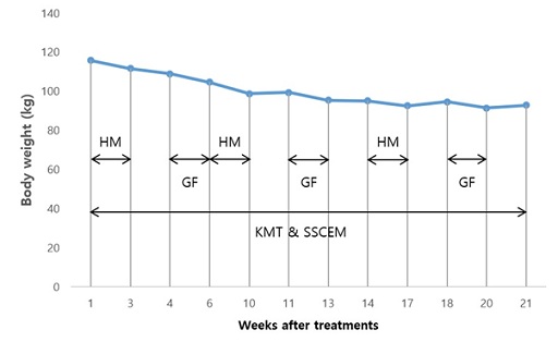 Figure 1: Treatment Timeline and Changes in Body Weight over time. HM: herbal medicine, GF: Gamrosu fasting, KMT: Korean medicine treatments, SSCEM: Space Spinal Conduction Exercise and Manipulation.