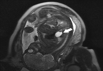 Figure 1: Fetal Magnetic Resonance Imaging (MRI) at 35 weeks: A structure with fluid signal is in a medial location (arrow) posterior to the heart, with a tubular morphology and contiguity with the esophagus. This structure measures 35 x 20 x 25 mm and has a thin, regular wall with folds inside, compatible with a herniated stomach.