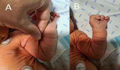 Figure 2: Skin laxity with prominent folds of the newborn. A. Skin stretching. B. Skin takes time to snap back to its original position because of compromised elasticity.