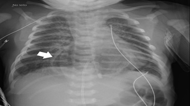 Upon admission to the pediatric intensive care unit, thoracoabdominal radiography (figure 3) and abdominal ultrasound demonstrated a partially intra-thoracic stomach, suggesting of a hiatal hernia with preserved diaphragm continuity. Echocardiogram revealed aortic isthmus narrowing with a maximum systolic gradient of 12 mmHg. The neonate was under continuous cardiorespiratory monitoring, and blood pressure, diuresis, and temperature were evaluated every four hours. He was breathing spontaneously with no signs of respiratory distress and had a nasogastric tube in passive drainage.