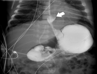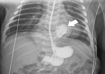 Figure 4: Upper gastrointestinal series on day 2 with an intra-abdominal stomach and significant gastroesophageal reflux (arrow).
