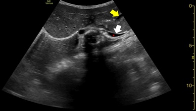 Figure 5: Diaphragmatic ultrasound on day 2 showing left hemi diaphragmatic reduced thickness and excursion (white arrow). Mild left pleural effusion is also seen (red asterisk). An almost empty intra-abdominal stomach can also be noticed (yellow arrow) in the anatomic position.