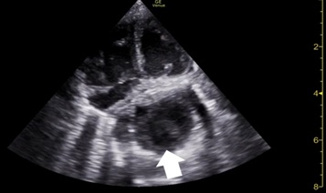 Figure 6: Echocardiogram on day 7, after a meal, showing left atria compression by the stomach (arrow).