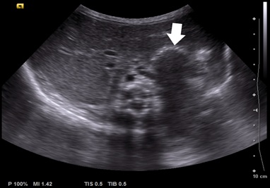 Figure 9: Abdominal ultrasound showing large hiatal hernia (arrow).