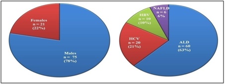 In the present study, cirrhotic liver subjects were in the age group of 25 to 65 years with a mean age of 43.27 ± 8.56; 78% (n=75) were males while 22% were females (n=21) with varying degree and different etiological factors (Figure 1).