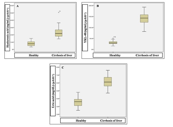Figure 2: Comparison of serum hyaluronic acid (A), YKL-40 (B) and uric acid (C) concentrations between healthy and cirrhosis of liver subjects.