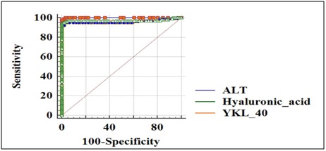 ROC analysis was carried out to define the diagnostic accuracy for serum HA and YKL-40 in cirrhotic liver subjects. Serum HA with an AUC of 0.961 (95% CI) with sensitivity 95.05% and specificity 97.80% and YKL-40 with an AUC of 0.973 (95% CI) with sensitivity 95% and specificity 99% compared with that of ALT with an AUC of 0.999 were observed (Figure 3).